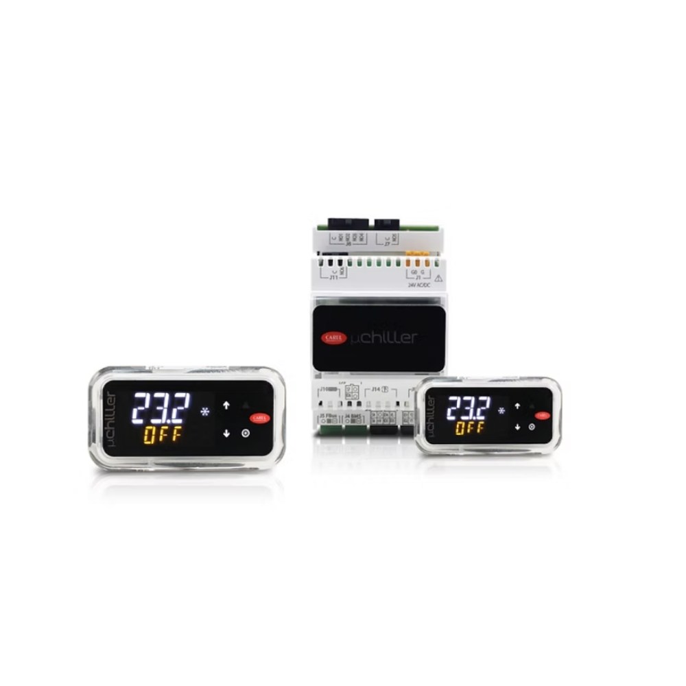 Carel μchiller, hava/su ve su/su soğutucular ile ısı pompası uygulamalarının yönetimi için geliştirilmiş parametrik chiller kontrol cihazı çözümüdür. Farklı kompresör mimarilerini destekleyen yapısı sayesinde sistem tasarımında esneklik sunarken, ilave genişleme kartı ile çift devre kullanım senaryolarına da uyarlanabilir. Mobil cihazlarla kablosuz erişim ve Applica uygulaması üzerinden NFC/Bluetooth tabanlı programlama kabiliyeti sayesinde devreye alma, parametre yönetimi ve servis süreçlerinde operasyonel verimlilik sağlar.